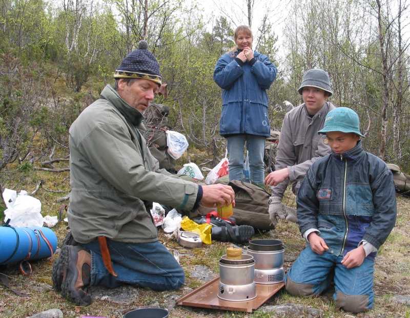 Heikki tuhjentää papusoppapurkin puhaltamalla. Heikki, Merja, Lauri ja Tuomas.